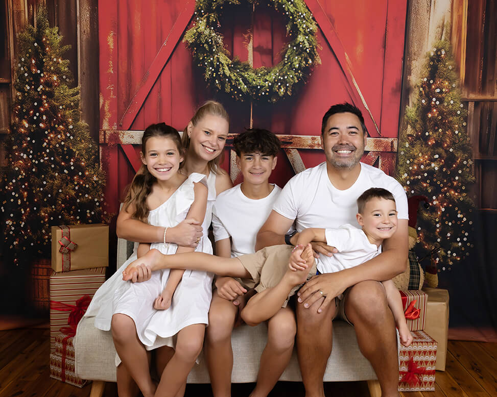The bold barn backdrop makes the perfect setting for larger families — plenty of room for everyone to gather together in one unforgettable portrait. Strong, warm, and full of festive tradition.